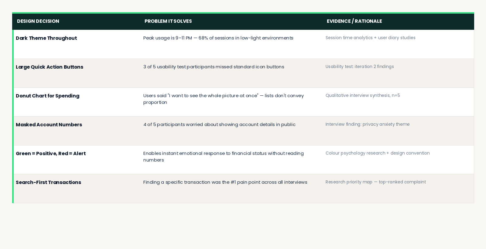 Solution: I introduced a progressive disclosure pattern. The dashboard shows high-level summary metrics first. Detailed views are always one tap away, never forced. The Spending by Category chart was moved to a side panel rather than the main content column, making it contextual rather than primary. Every addition to the dashboard during iteration made it worse removing features consistently increased satisfaction scores.