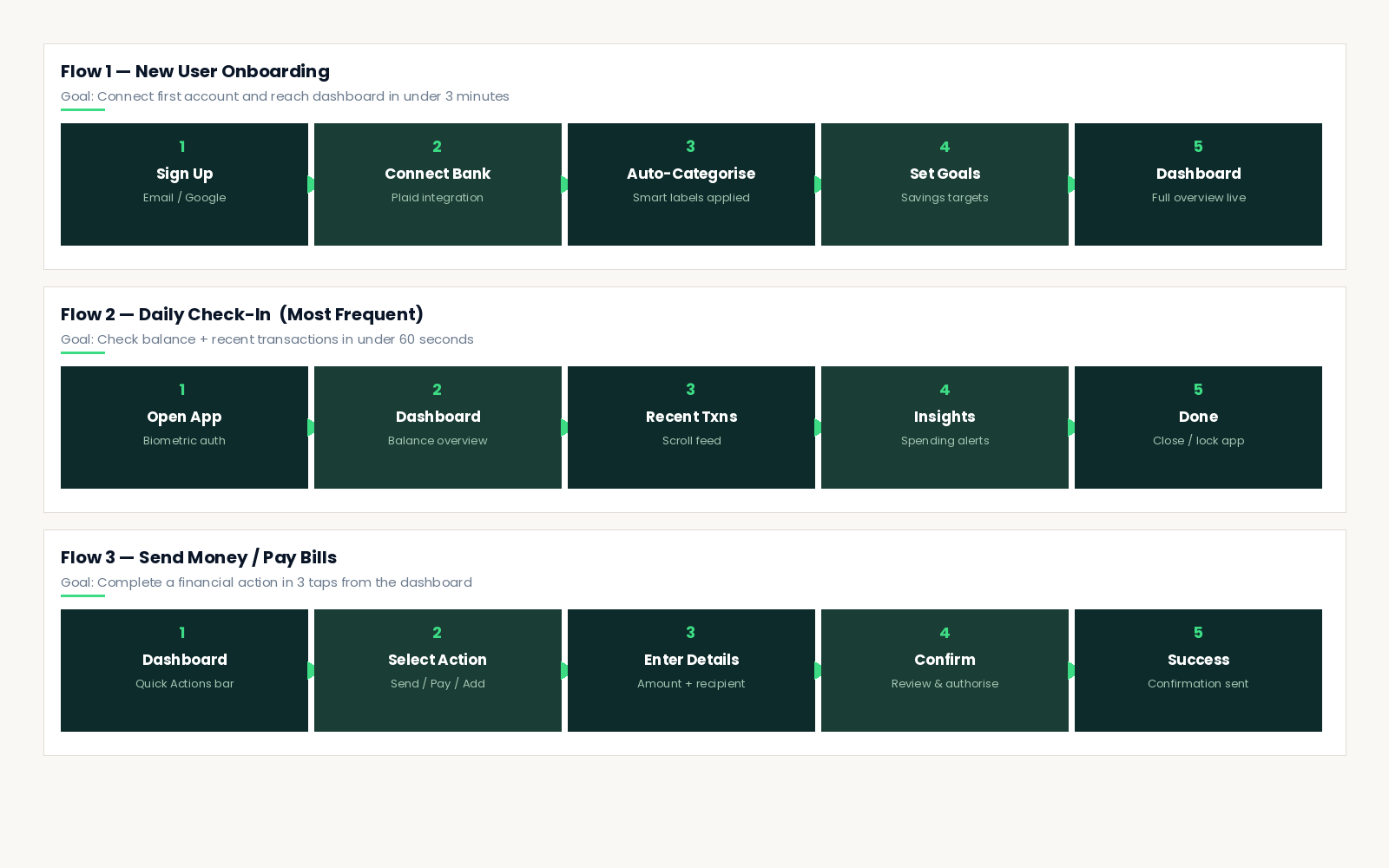 Early dashboard prototypes tried to show everything simultaneously spending trends, recent transactions, all accounts, investment data, and savings goals on one screen. Usability testing revealed that users felt anxious, not empowered.