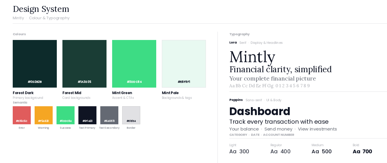 Mintly's visual language was designed to communicate three qualities that users said they valued most in a finance app: trust, clarity, and intelligence. Every visual decision supports a user's ability to quickly understand their financial state.