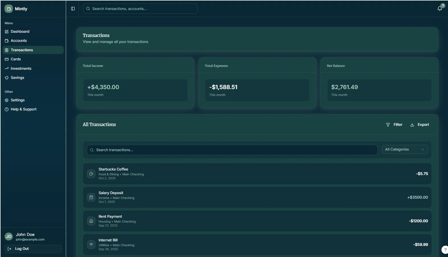 Mintly is a personal finance management application designed to give users a complete, real-time picture of their financial health — balances, spending, investments, and savings — all in one interface. It bridges the gap between traditional banking apps and sophisticated financial tools, without the complexity.